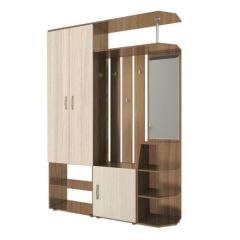 Состоит из: шкафа с выдвижной штангой, вешалки с крючками для одежды и сумок, обувницы, открытых полок, зеркала, полки для головных уборов, выдвижного ящика. Сборка универсальная, рисунок на фасадах не универсальный. На прихожей в цвете белый рамух нет рисунка.