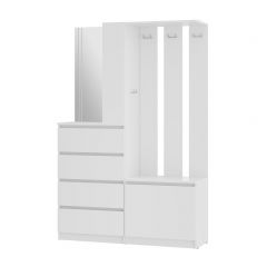 Прихожая имеет простой дизайн и прямые формы. Она состоит из вешалки с тумбой и пенала. Открытая вешалка оборудована полкой для головных уборов, тремя 3-х рожковыми крючками для одежды, ниже выдвижной ящик на роликовых направляющих, под ним открытая ниша с полкой. За распашными дверьми пенала три полки. Тип сборки и направление открытия дверей определеяется при сборке.
